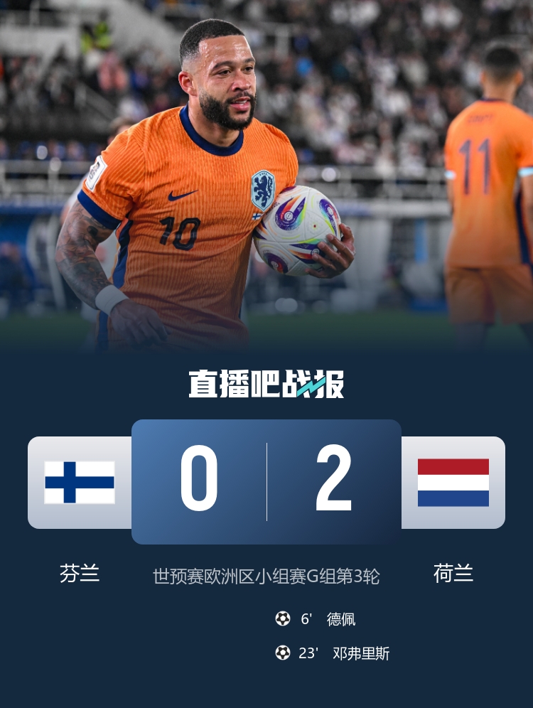 世预赛欧洲区小组赛G组第3轮,德佩、邓弗里斯进球,荷兰2-0战胜芬兰。