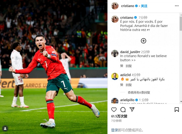 社交媒体上,C罗写道:为了我们,为了你们,为了葡萄牙!明天让我们再次创造历史!